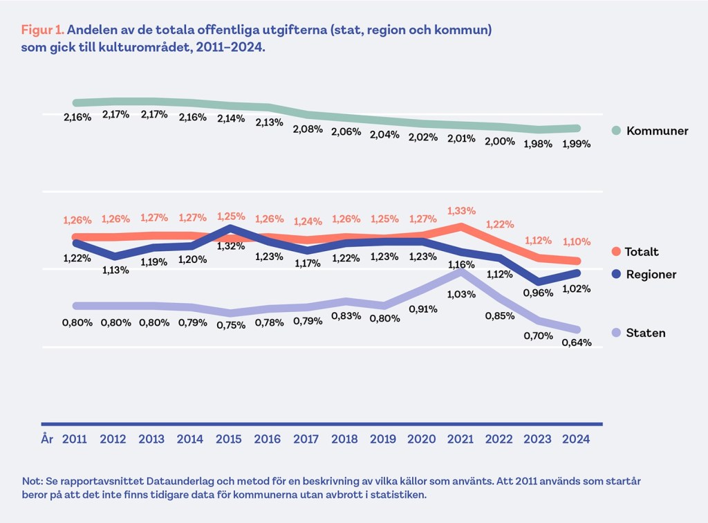 Andelen av de statliga utgifterna som går till kultur har gått ner från 0,83 till 0,64 procent mellan 2018 och 2024. Tittar man på statens budgetar för 2025 och 2026 är det tydligt att trenden fortsätter. 2026 når kulturbudgeten sin lägsta nivå på över 25 år, endast 0,62 procent.